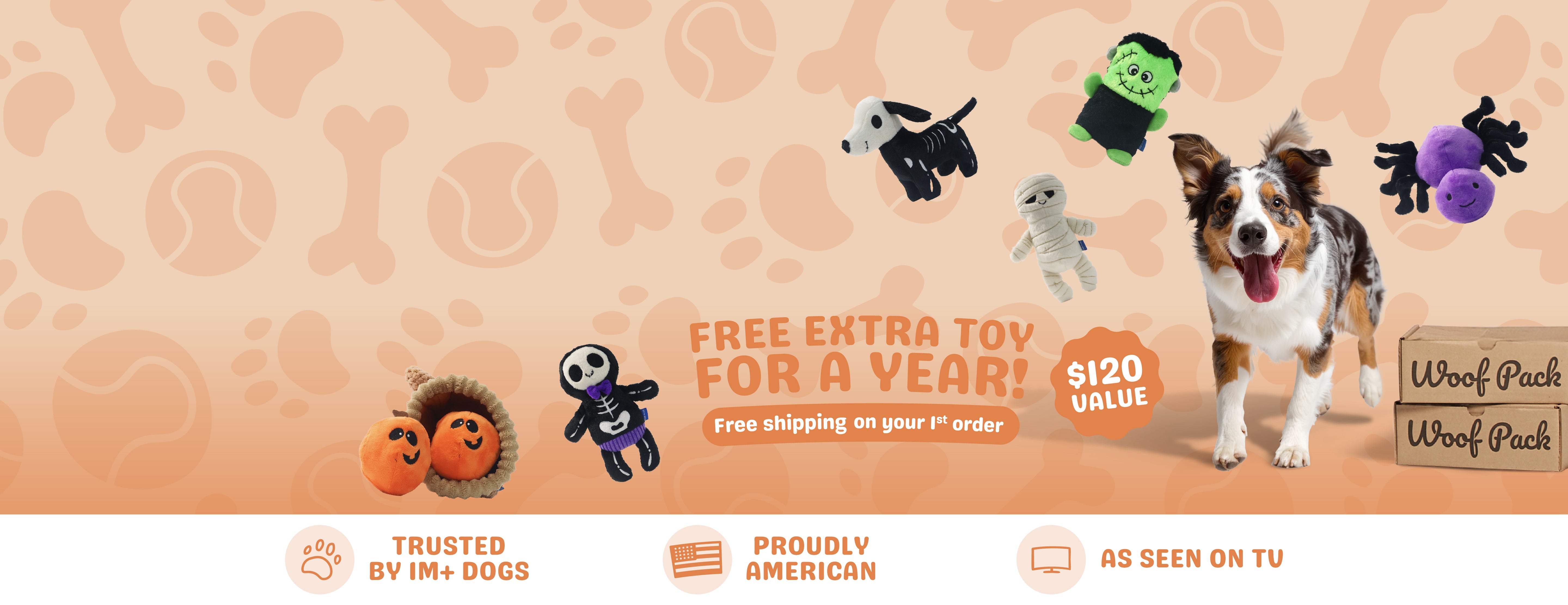 Choose a monthly Woof Pack subscription starting at only $23/month, and get toys and treats delivered to your door.